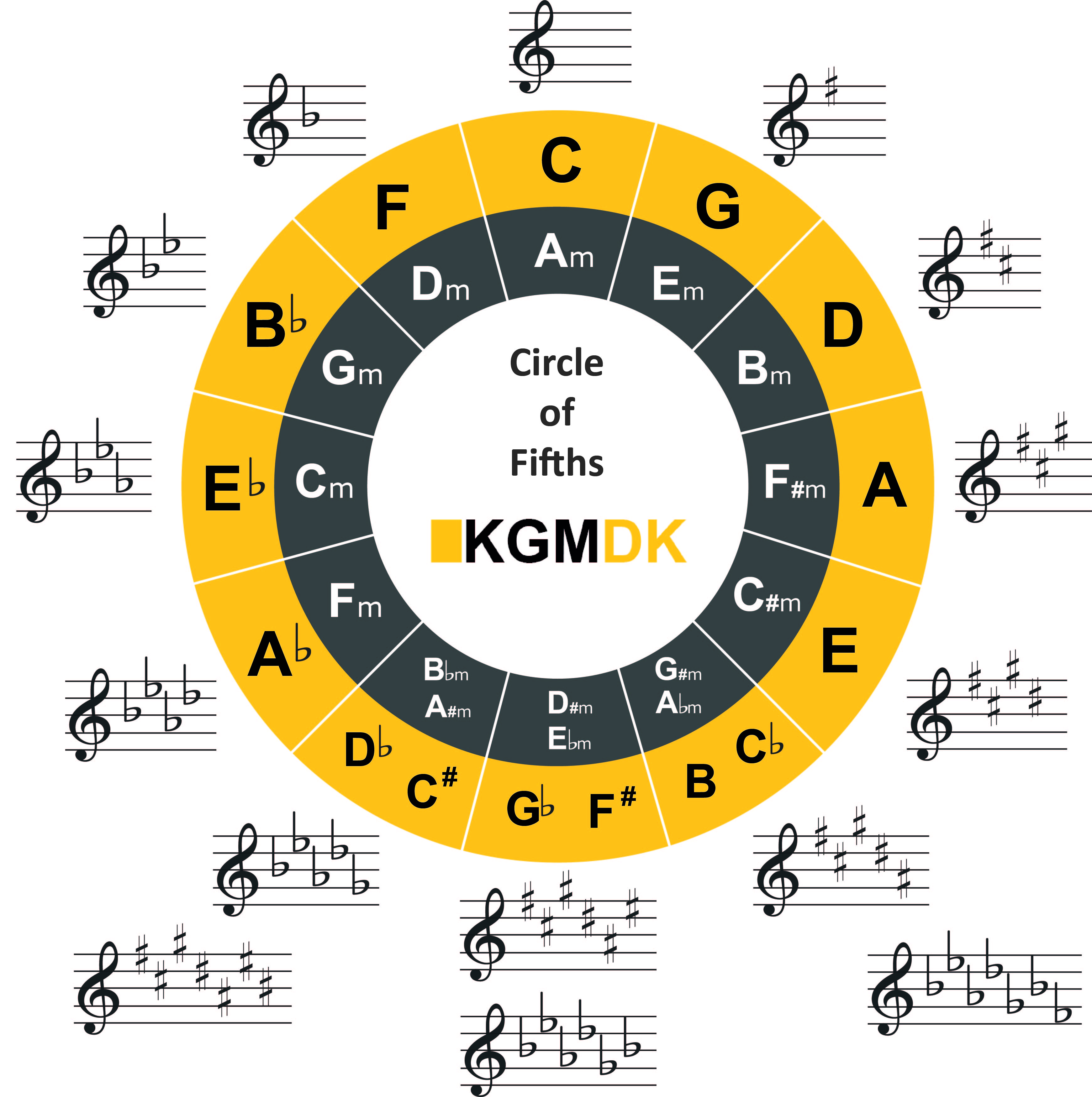 Vi har lavet en grafisk visualisering af kvint-cirklen. Du kan klikke på grafikken nedenfor og få en stor version af billedet.
